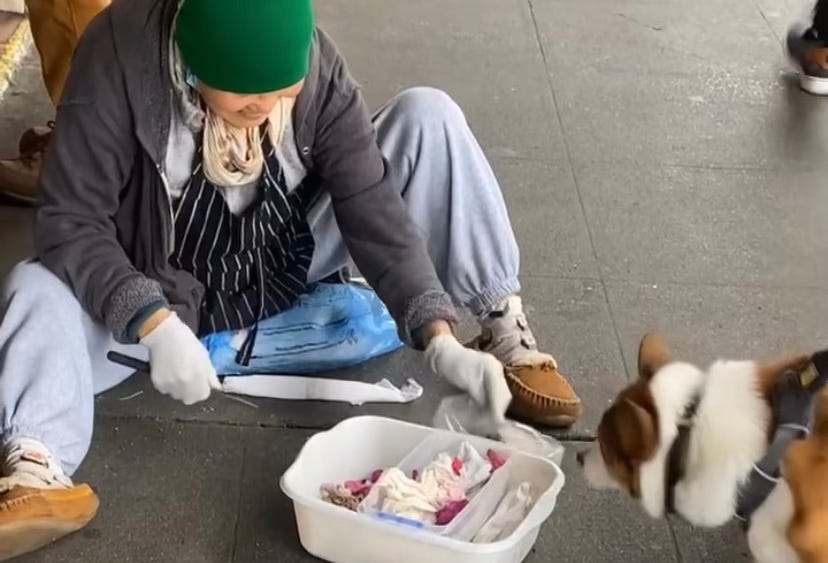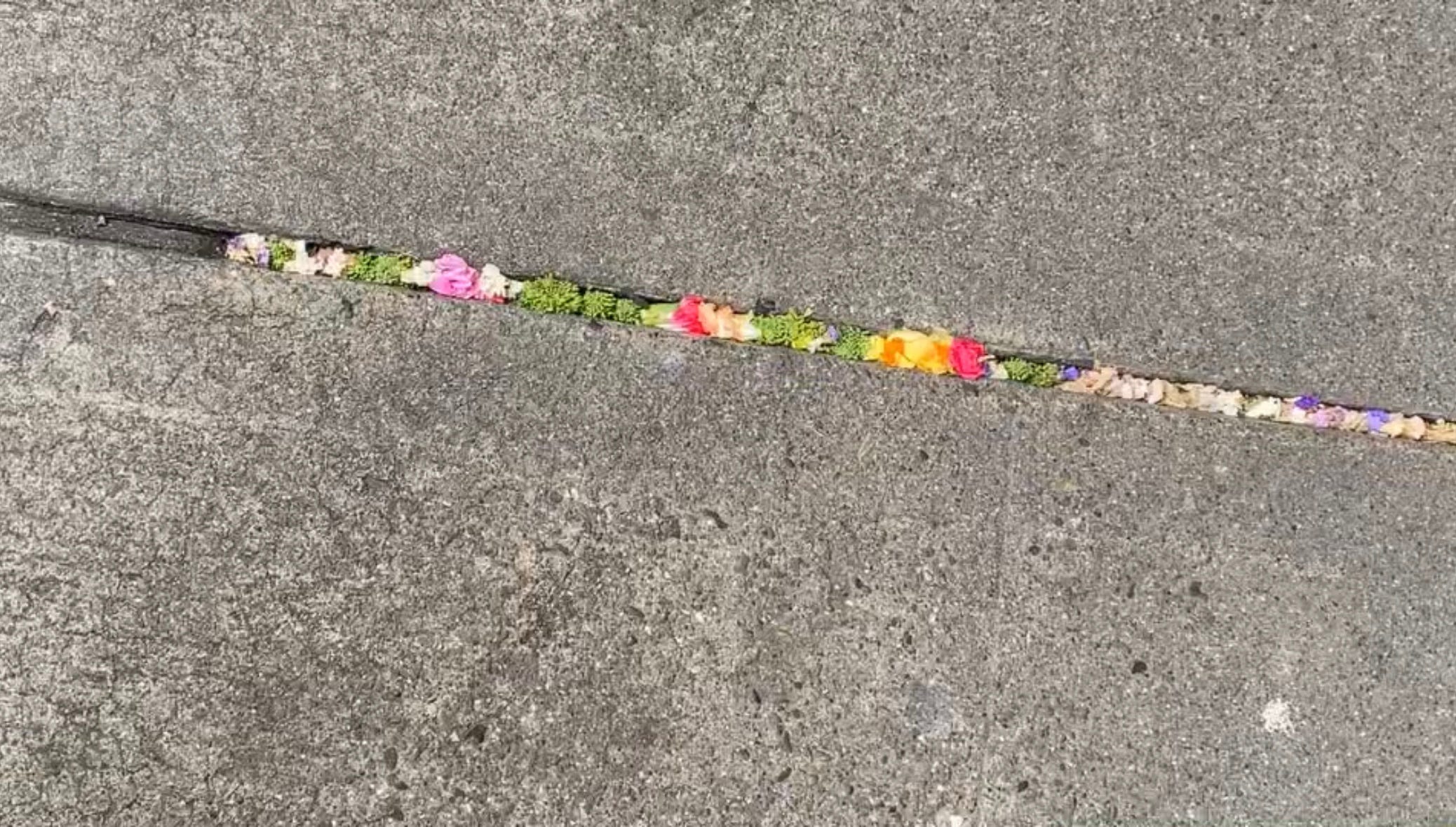 Sitting cross-legged while people hurried past, a humble figure leaned over and meticulously placed small flowers, collected from a small plastic container, into the seam.