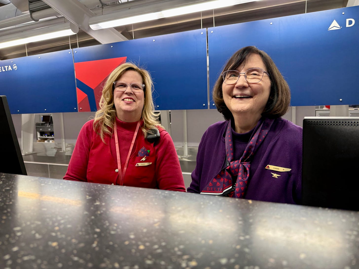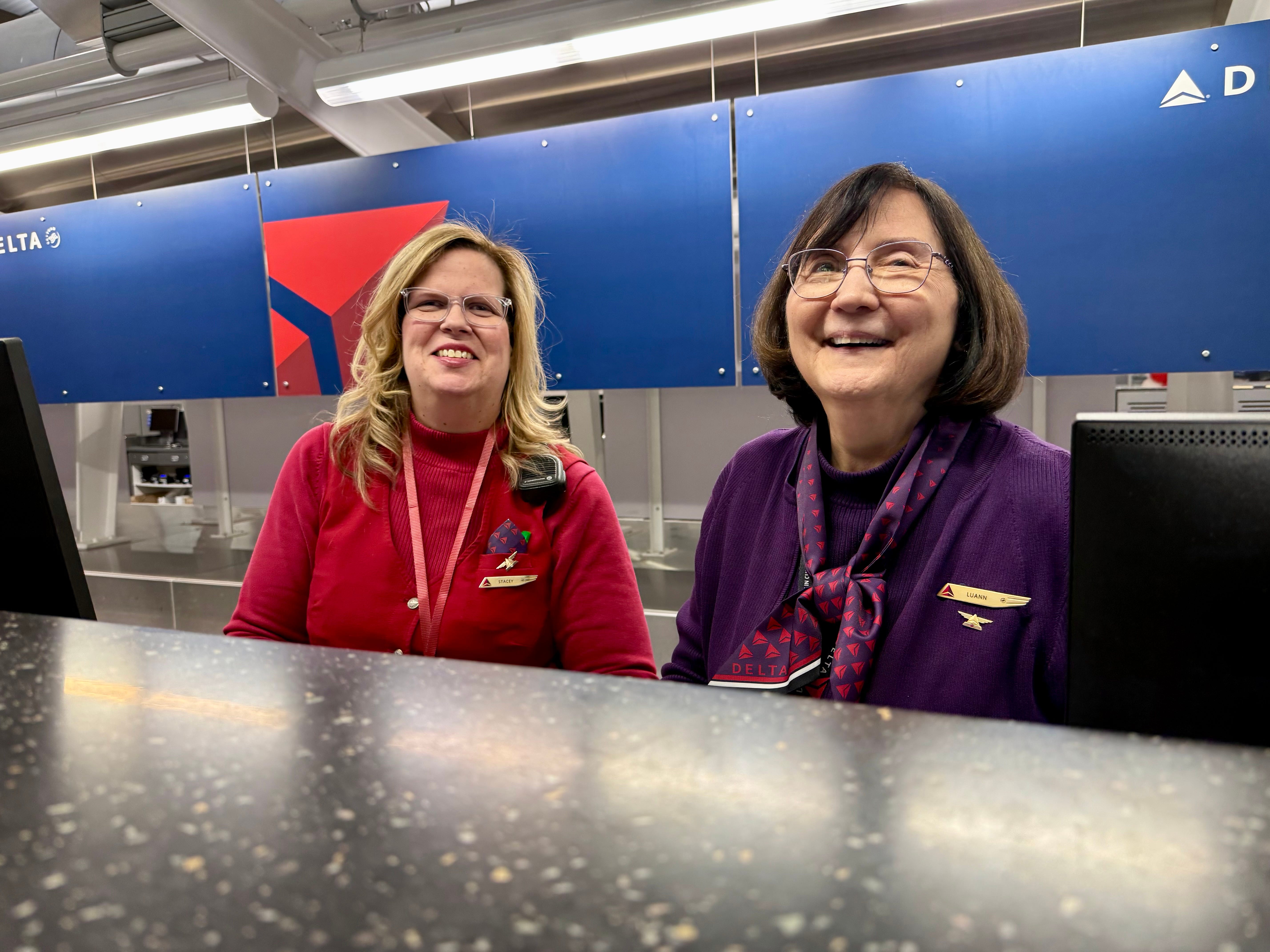 We ran up the escalators to the Delta desk.